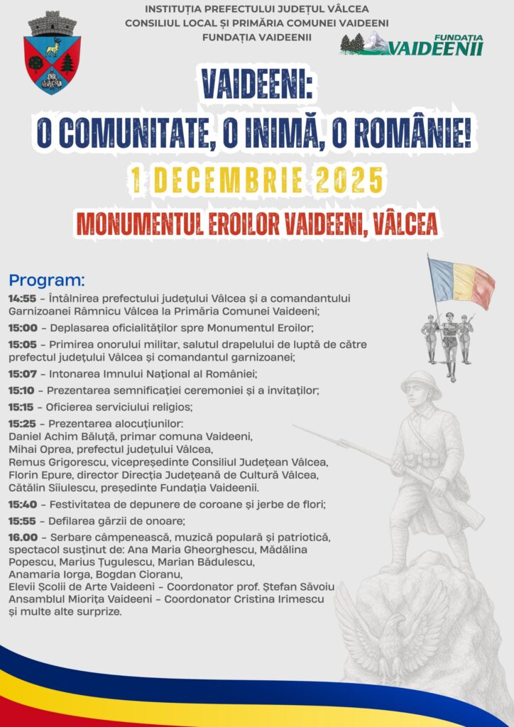 September 18, 2023De Ziua Națională a României veniți acasă la Vaideeni, suntem o Comunitate, o Inimă, o Românie! Ceremonial militar și religios, alocuțiuni, depuneri de coroane de flori, spectacol artistic și voie bună. Luni, 1 Decembrie 2025, ora 15, la Monumentul Eroilor din Vaideeni. La mulți ani Români! La mulți ani România!